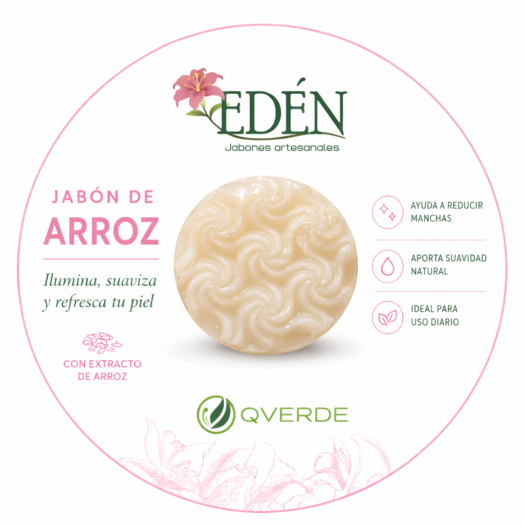 Descubre el poder natural del arroz en tu rutina diaria de cuidado facial. El jabón artesanal de arroz EDÉN está formulado para ayudar a mejorar la apariencia de la piel, aportando suavidad, luminosidad y frescura desde el primer uso, con envoltura en vinipel ecológico certificado.